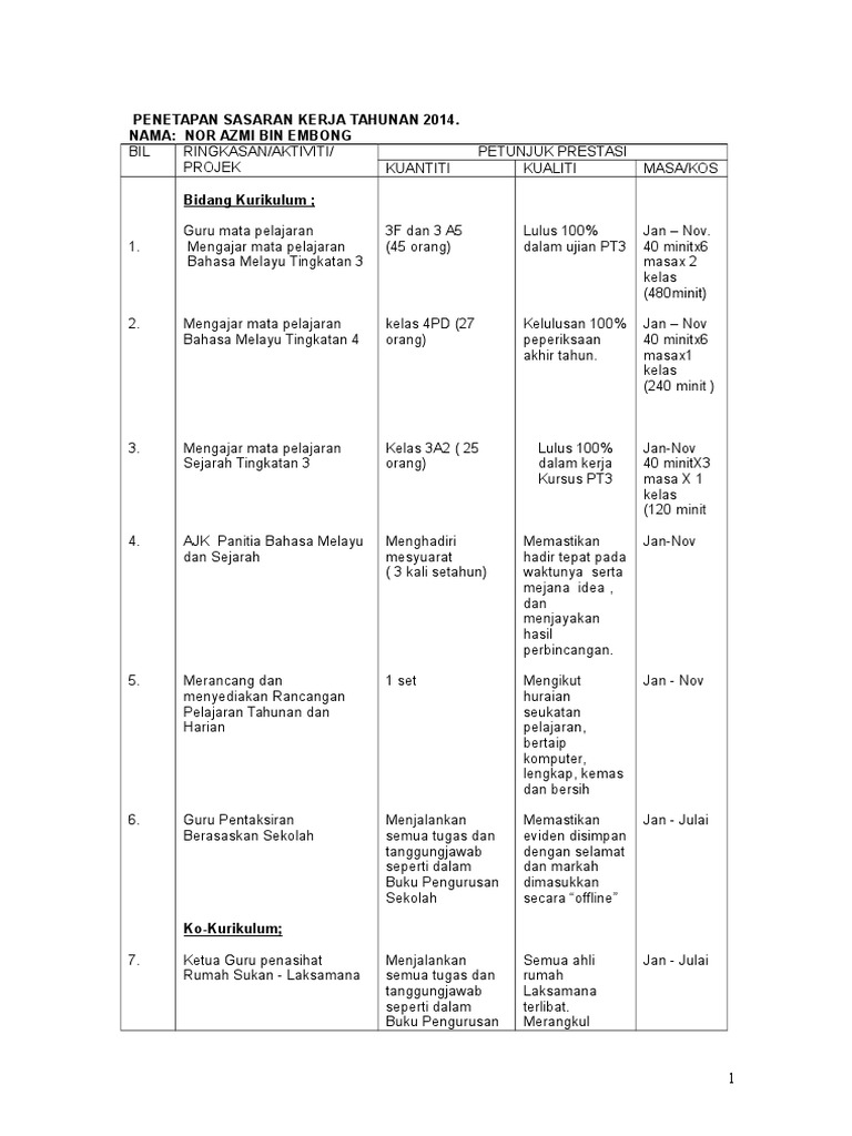 Sasaran kerja tahunan contoh pengisian sasaran kerja tahunan dan laporan pencapaian bil. SHAHRIZAN BINTI WAHABBIL RINGKASANAKTIVITI PETUNJUK PRESTASI PROJEK KUANTITI KUALITI MASAKOS Bidang Kurikulum 1. Kertas kerja perniagaan lm 2025 1.